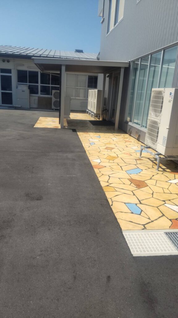 発色の良い黄色のスタンプコンクリート施工⭐️ 穴にカラフルなビーズやひよこが入ってるのが可愛いですね😍🐤