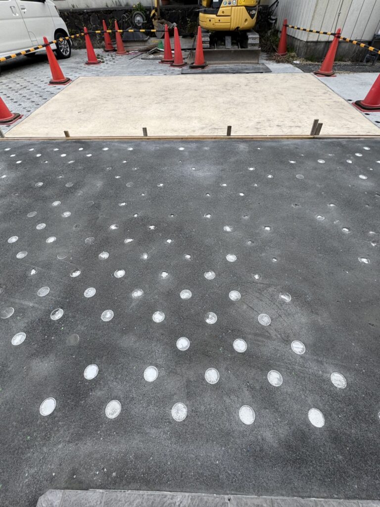 家の駐車場をDotcon施工🚧 スタンプと洗い出し施工🐾 洗い出しは蓄光石を散らして仕上げてくださいました。 チラチラとカラフルな石が見えて可愛いですね😊