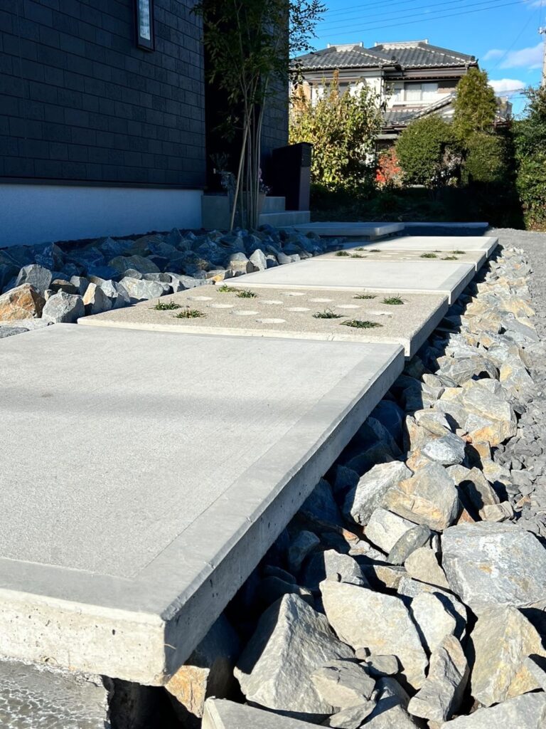 Dotconは、戸建住宅のエクステリアにもご活用いただけます。 全面をドットコンで施工するのに抵抗がある方は部分的にドットコンを使用することもできます! 今回は、通常のコンクリートとドットコンを交互に施行し、脇にライトを設置しました。 夜にはライトが付き、モダンな雰囲気を演出できます!