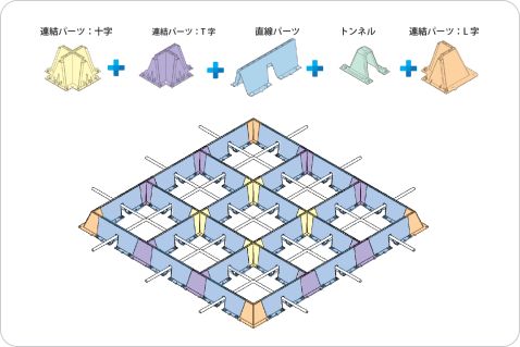 Dotcon+は、パーツを組み合わせるだけで施工可能。 特別な道具も職人技も不要で、DIYや自治体の短工期案件にも対応できます。