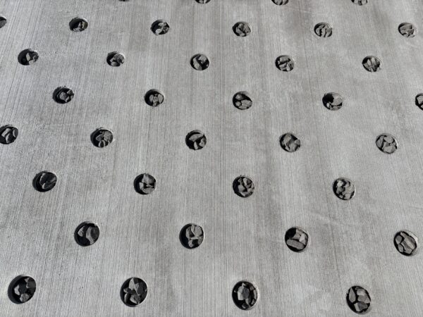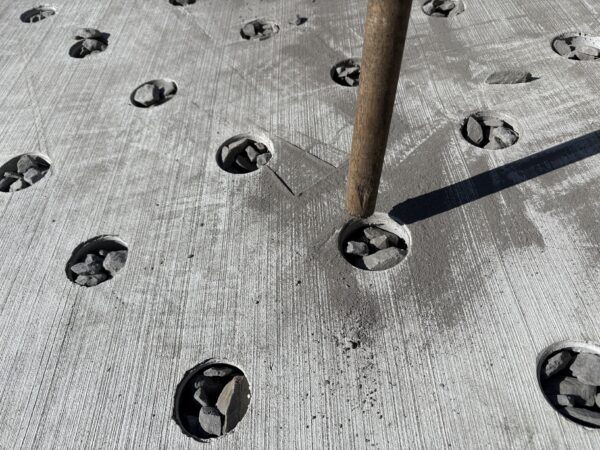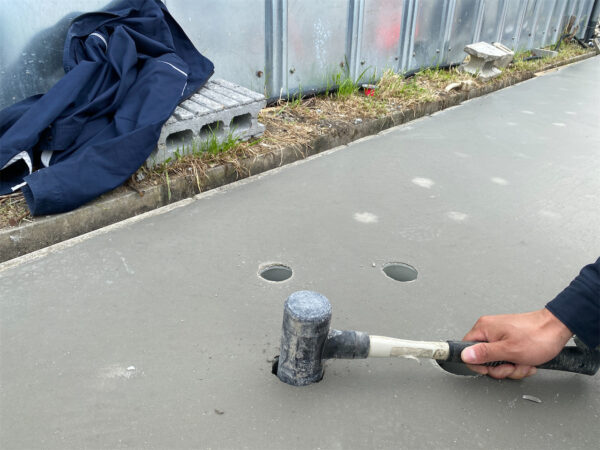 コンクリートが硬化したら、ドット部をハンマーで叩き落とす。