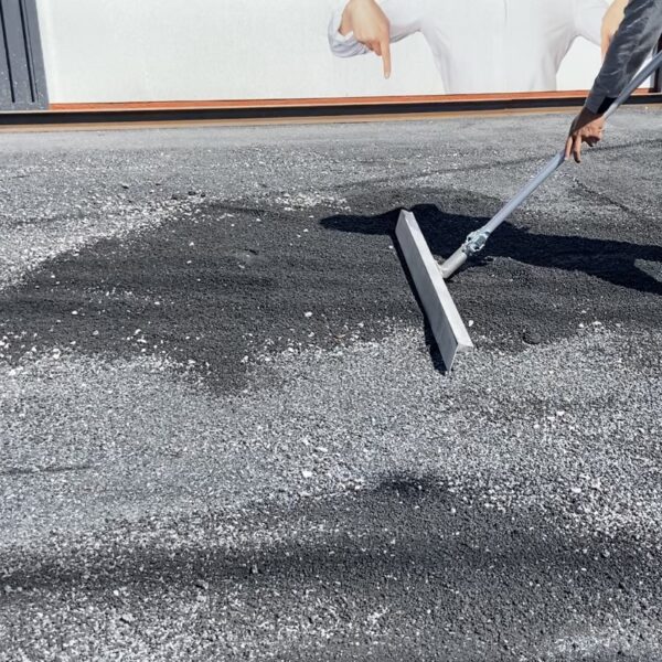 レーキや荒熊手等を使用してドット孔へ単粒度砕石3号程度を充填し、木槌もしくはゴムハンマーで舗装天端レベルまで転圧する。
