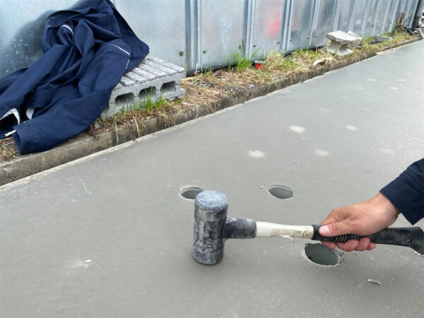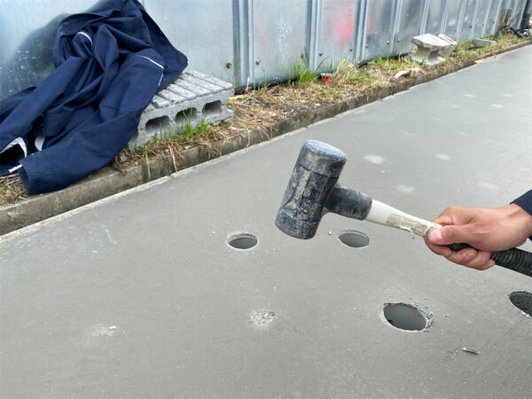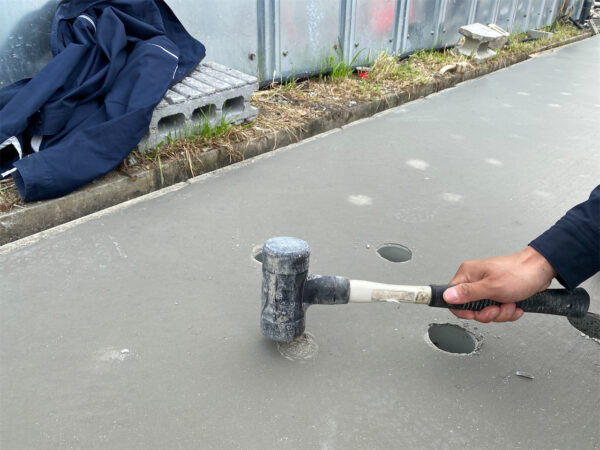 コンクリートが硬化したら、ドット部をハンマーで叩き落とす。