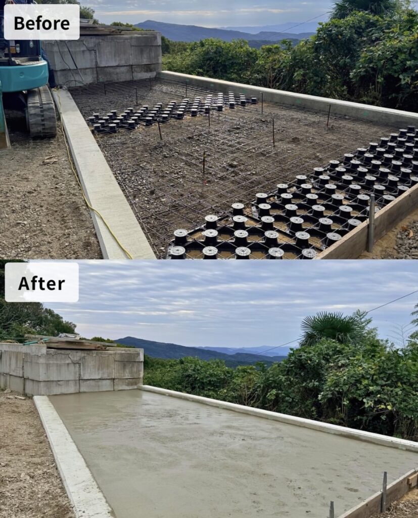 現場には少し勾配があり、全てをコンクリートで固めてしまうと雨水などが全て流れてしまいます。