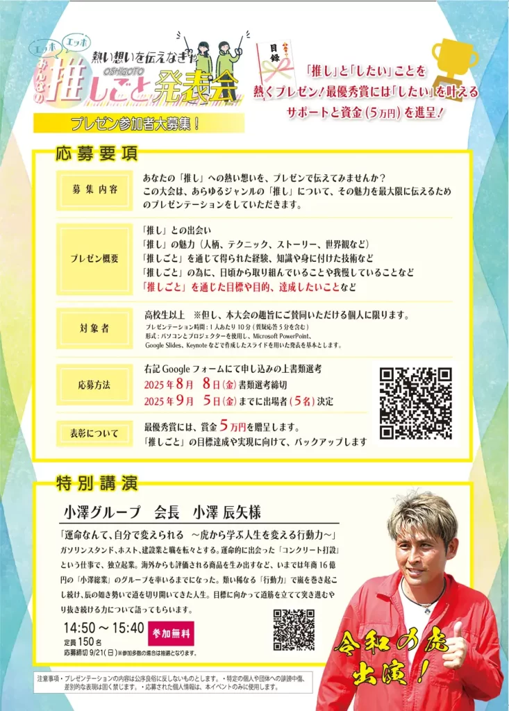 代表・小澤辰矢が「みんなの推しごと発表会」にて特別講演・審査員として登壇いたします(2025年9月27日)