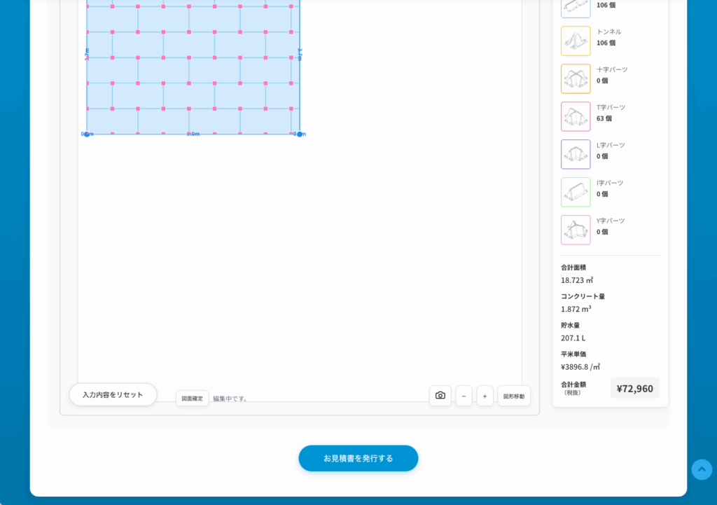 また、Dotcon+ の簡易お見積もり機能を新たに追加し、・必要パーツ数量の自動算出・貯水量の計算・生コン使用量の算出がワンタッチで可能になりました。